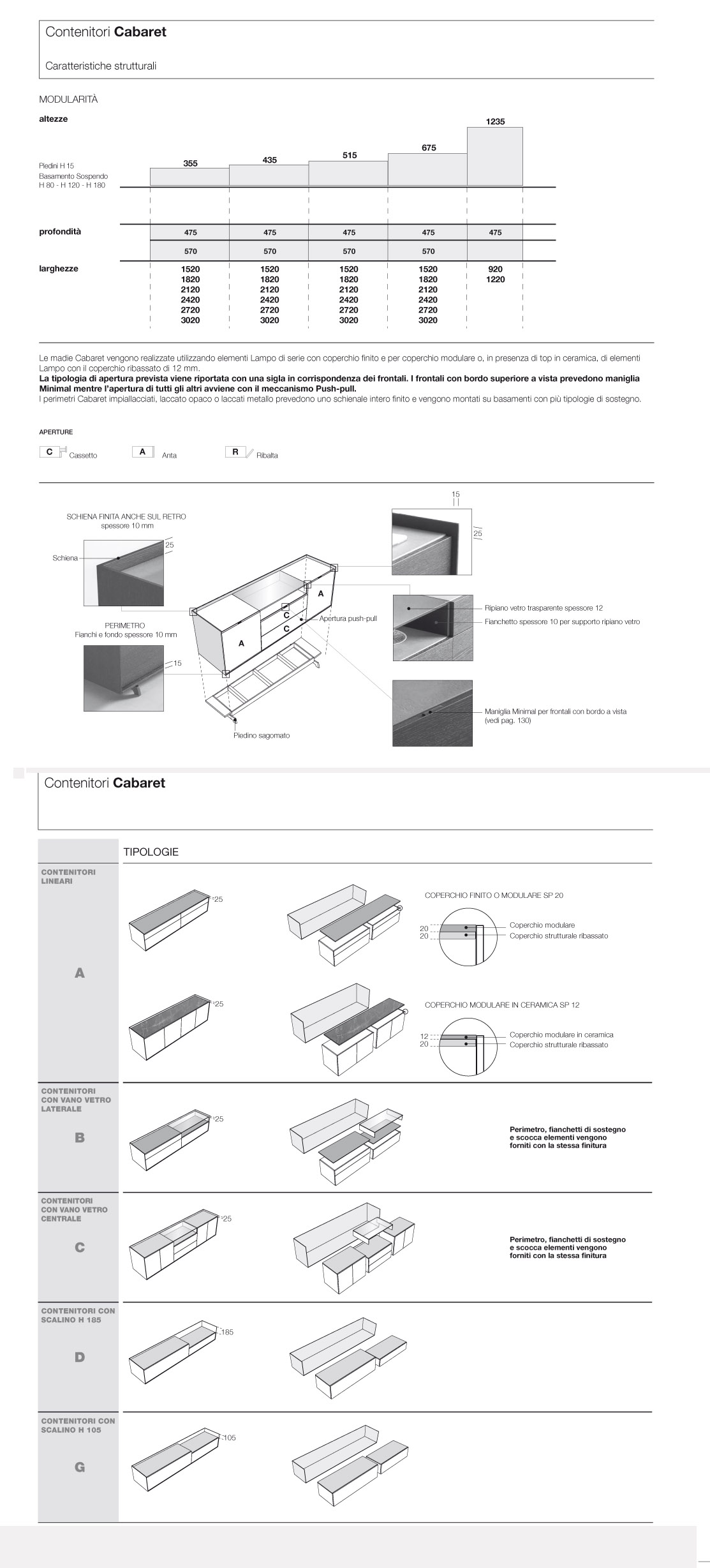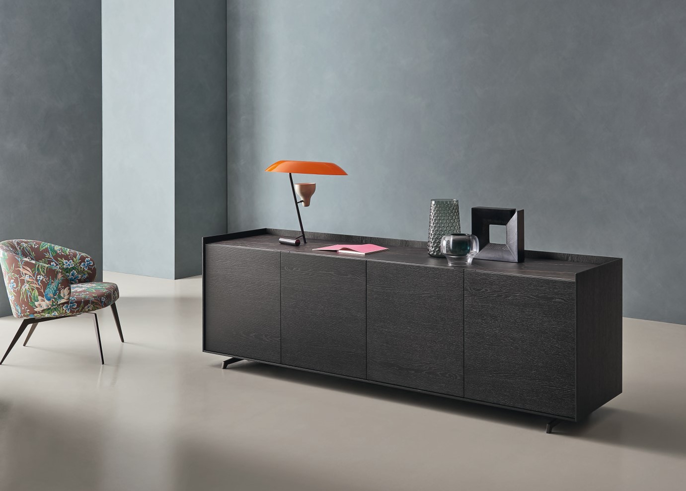 With its 10 mm thick perimeter, Cabaret has an elegance that is classic but always on trend, playing on a combination of volumes, glass surfaces and open compartments. The elements with different heights allow you to create different configurations, with display spaces of various sizes. There are also many possibilities for supporting the furniture: on feet, on the ground on low feet or wall-hung. In the photo, the sibeboard is entirely in Noce veneer, with noir Desir ceramic top and cylindrical feet, height 180 mm in Brown.